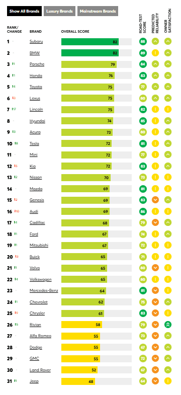 A finales de 2025 se renovó el ranking de Consumer Reports (CR). CR es una organización independiente que trabaja de la mano de los consumidores para mostrar con transparencia y de manera justa el mercado. Con más de 90 años de historia, ha analizado las marcas de coches presentes en el territorio americano y ha evaluado a Subaru como la mejor marca, superando marcas premium y generalistas. También ha quedado segunda en los test en carretera y tercera en términos de satisfacción de cliente, lo que apuntala la reputación de fiabilidad y calidad que siempre ha caracterizado a Subaru. Además han señalado a los modelos Crosstrek y Forester como los mejores coches / SUV de su categoría.